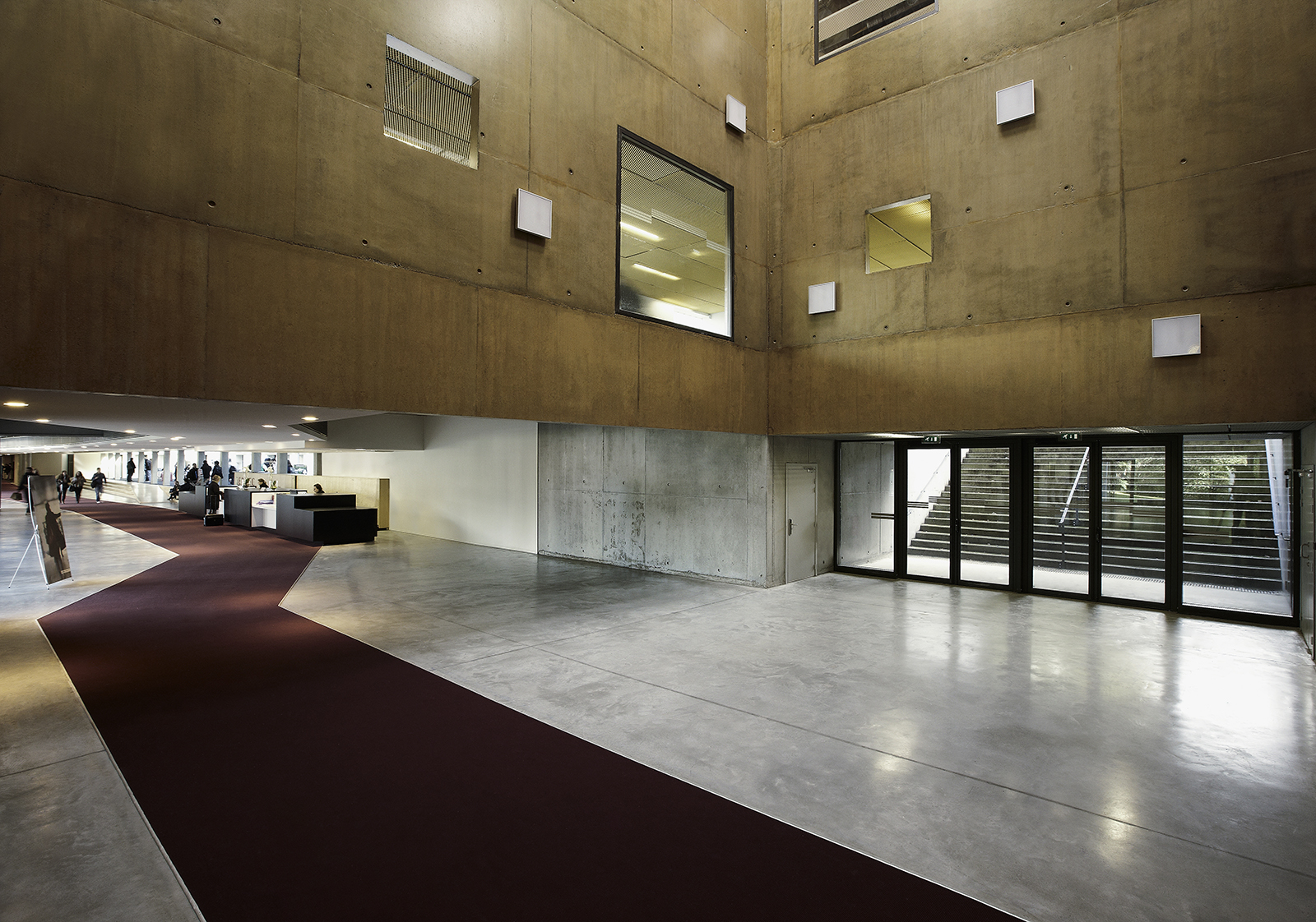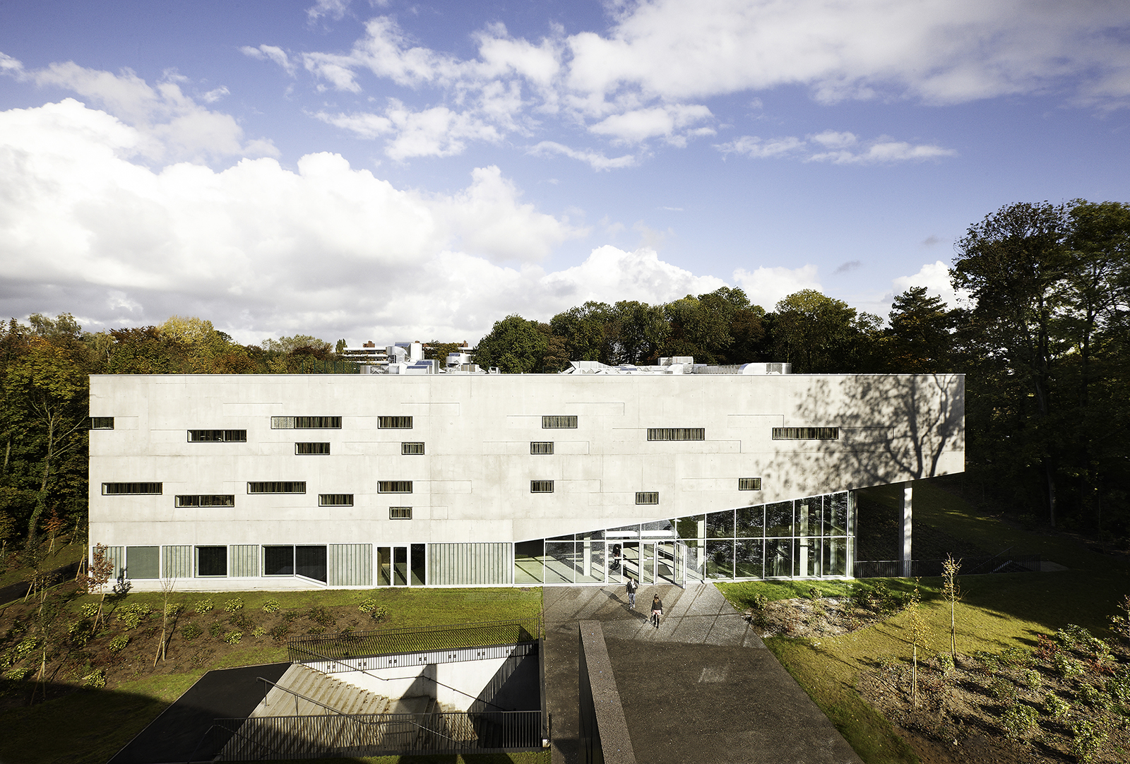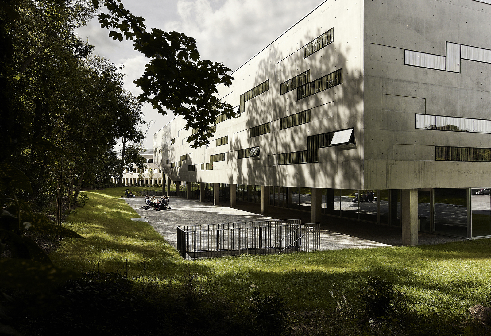 Dans le but de préserver le parc, le projet s’implante prioritairement sur la surface minéralisée du parking existant situé en limite Sud-Ouest du terrain. On y retrouve les logements étudiants ainsi que le complexe sportif à l’entrée Ouest du site. Le projet tire parti de la douce déclivité du terrain pour définir un niveau de référence continu issu du sous-sol du bâtiment de bureaux existant, libérant le niveau bas pour y maintenir le parking. Perpendiculairement à cet axe Ouest-Est est créé un axe Nord-Sud qui organise le reste du projet. Il se matérialise par la création d’une circulation au niveau inférieur qui met en connexion le bâtiment d’enseignement au Nord, le bâtiment existant de Buffi, où sont aménagés les locaux administratifs, et le restaurant au Sud. Baptisé « forum » et conçu comme une rue couverte de 130m de longueur, cet espace devient le lieu de croisement de tous les flux. Alternativement ouvert sur les jardins, sur l’atrium du restaurant ou sur le hall-cathédrale de l’enseignement, il se décline en gradins, bibliothèque et amphithéâtre suivant les zones. A l’extérieur, le forum crée une place basse et une vaste terrasse haute en pied de l’administration. Une large passerelle piétonne qui borde le parc, en surplomb sur le parking, permet la liaison avec les logements étudiants et le complexe sportif.
