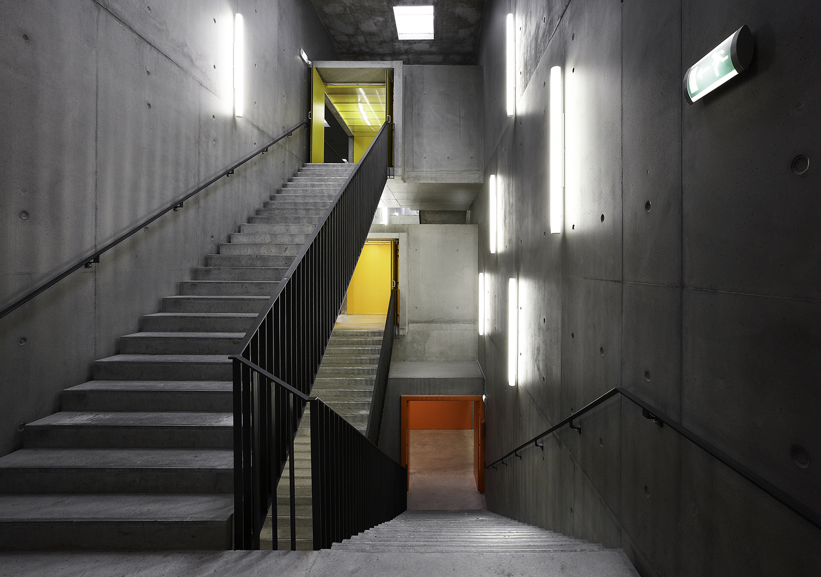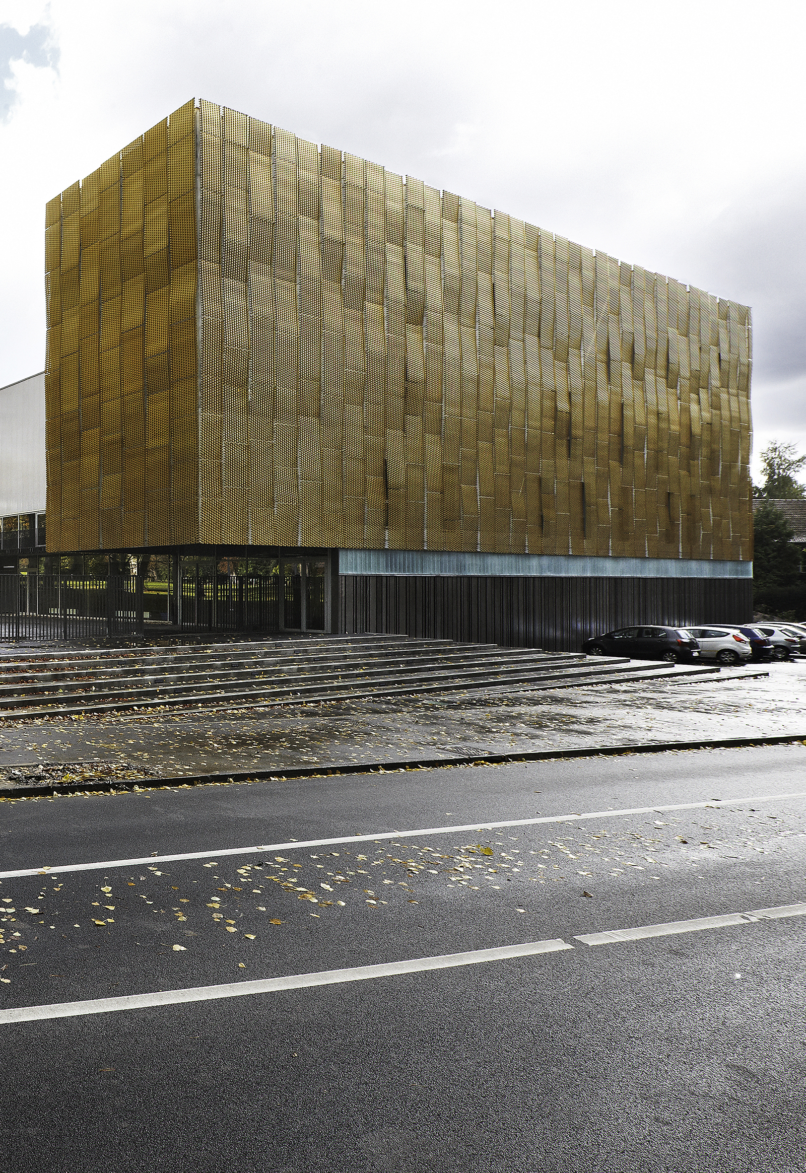 Malgré une palette restreinte et l’usage de matériaux bruts, le projet cherche à établir des ambiances contrastées. La structure est en béton. Des continuités de matériaux s’établissent et lient les espaces entre eux (faux plafond en métal déployé, tapis rouge du forum, béton lasuré naturel, etc.). Ils sont agrémentés par des touches de couleur marquée. Les façades des divers bâtiments neufs combinent essentiellement l’aluminium, le verre et le béton lasuré naturel, le béton matricé lasuré noir et par touches le verre profilé armé et le polycarbonate translucide. Pour affirmer sa présence sur l’espace public, la salle de sports reçoit une vêture en métal déployé dorée. Les façades des bâtiments existants sont rénovées pour retrouver leur état d’origine.