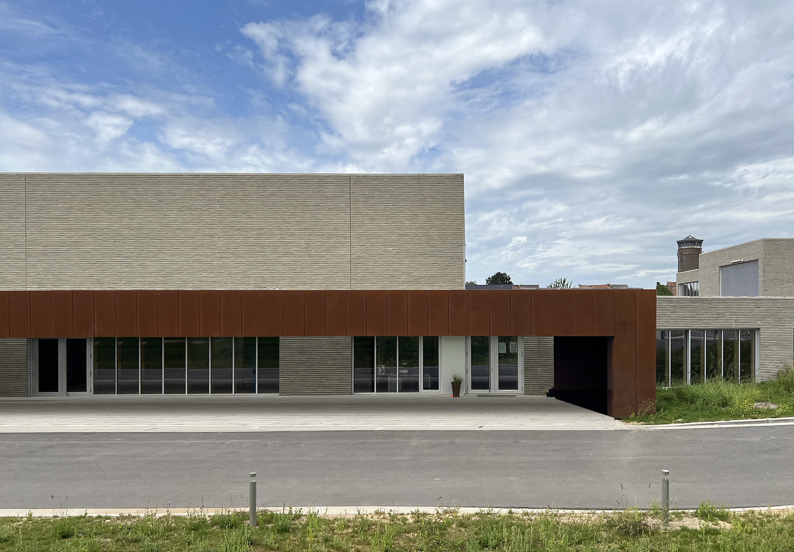 Les matériaux en façade sont répartis suivant l’expression fonctionnelle du projet. Ainsi, à l’exception du préau d’entrée habillé de tôles d’acier corten, l’ensemble du bâtiment neuf reçoit un parement de brique. La brique est mise en oeuvre de façon à marquer les joints horizontaux, définissant une esthétique résolument tellurique. Les menuiseries extérieures sont en alu-bois : en aluminium anodisé à l’extérieur et bois à l’intérieur. Les finitions intérieures sont le plus souvent brutes et marient le béton lasuré, plafonds acoustique en panneaux isolant composite, béton quartz et sols souples au sol, menuiseries bois, etc.