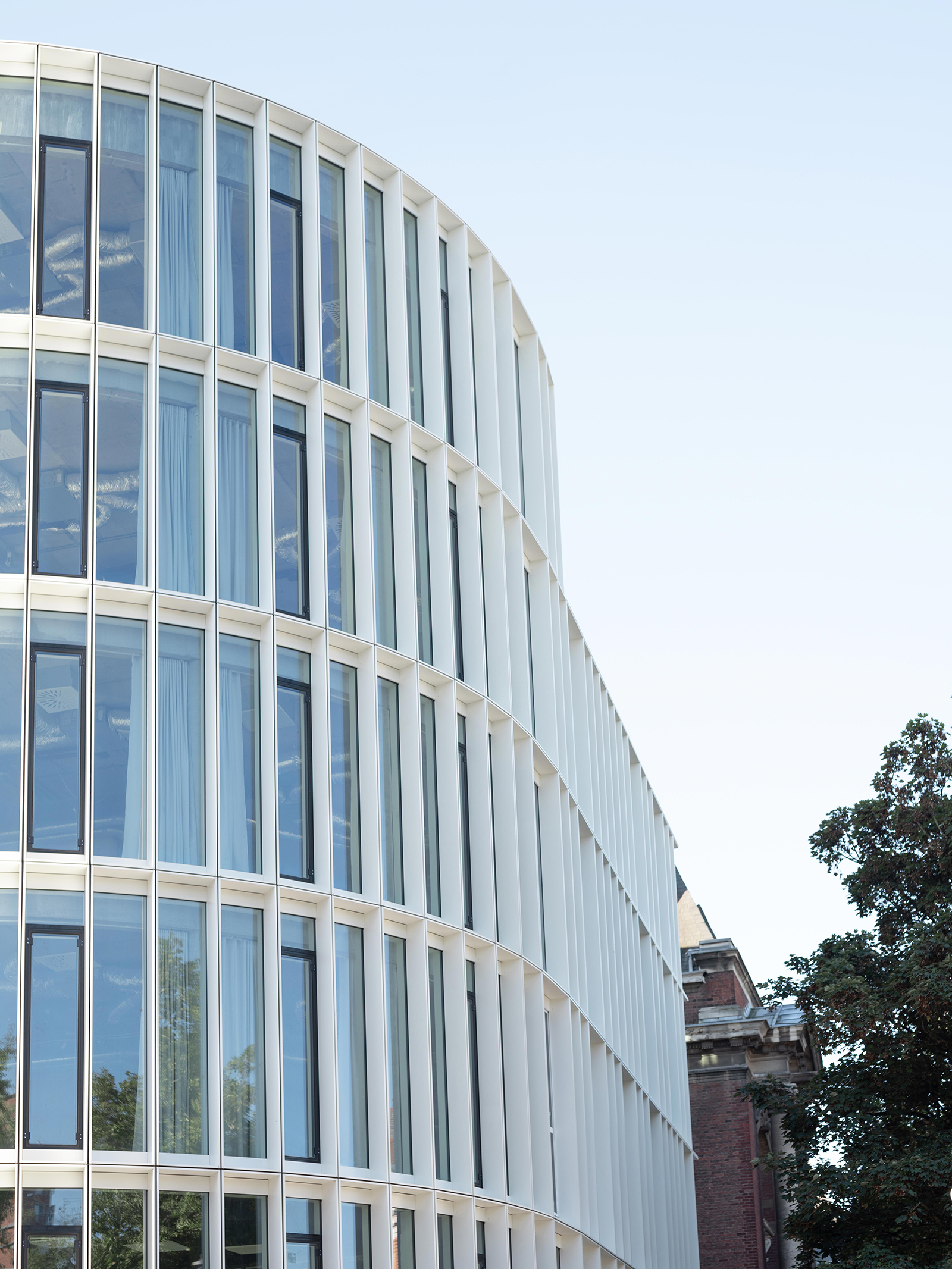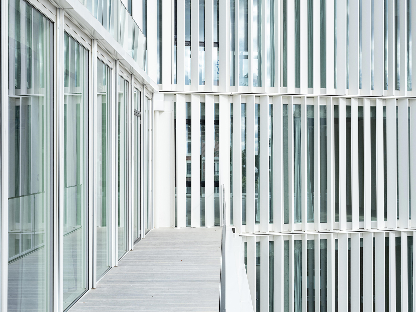 L’identité du bâtiment d’angle est d’abord générée par son enveloppe extérieure. Les montants et traverses en saillie sur le vitrage animent la façade et protègent le vitrage d’un rayonnement solaire trop important. Ils mettent en évidence la superposition des étages et sa volumétrie atypique. En façade Ouest, des brises soleils complètent le dispositif de protection tout en s’intégrant dans l’écriture globale du bâtiment. Le Pavillon affiche en façade l’empilement des fonctions programmatiques qu’il abrite. Verre, bardage et maille métallique se superposent. L’emploi du verre et de l’aluminium de teinte blanche unifie l’ensemble de l’opération, et produit un effet de contraste avec les bâtiments existants.