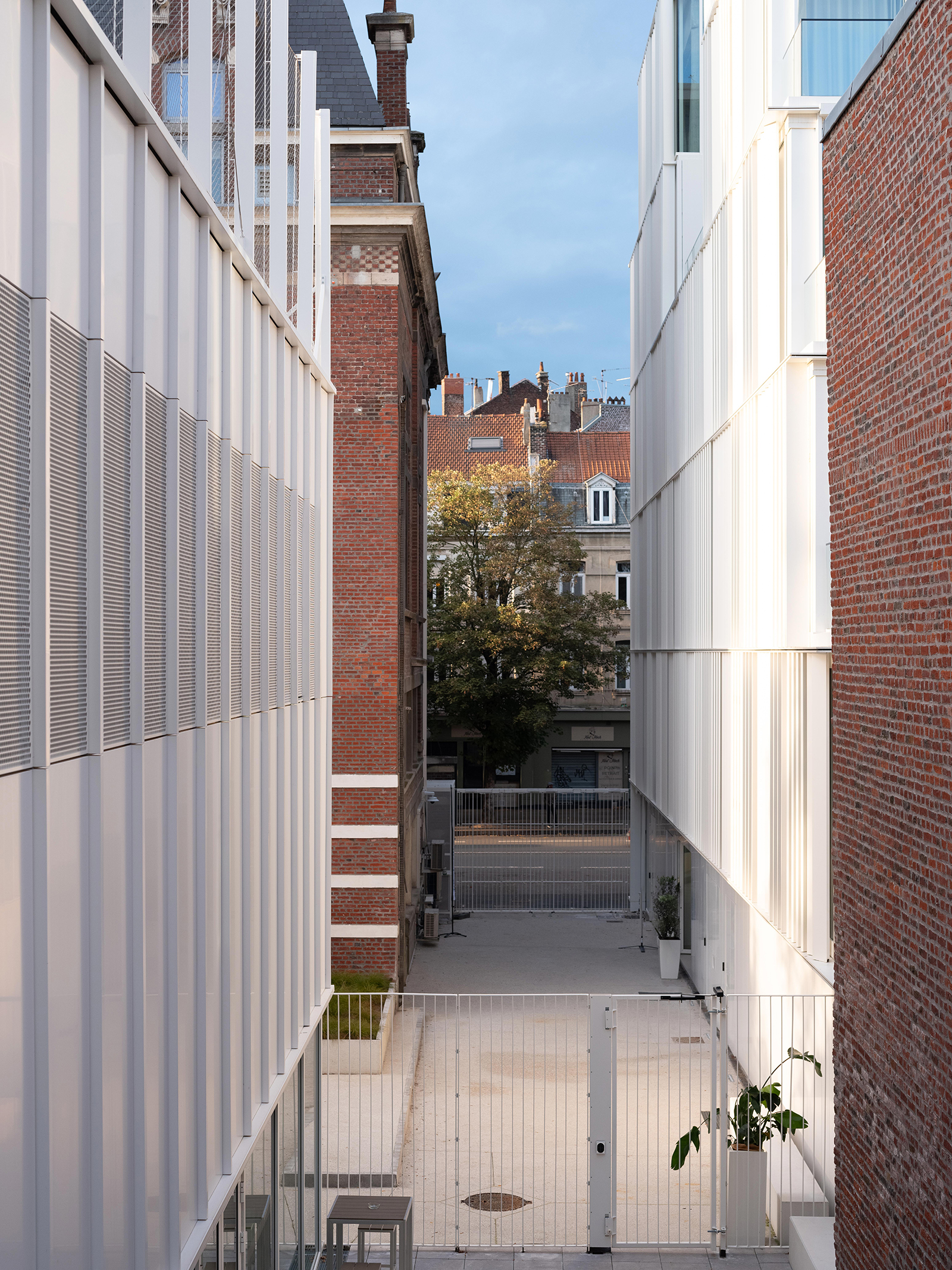 Une nouvelle entrée publique est créée depuis le boulevard Louis XIV. Le projet est constitué de deux bâtiments implantés en quinconce l’un par rapport à l’autre, auxquels s’ajoute le réaménagement d’une maison existante qui fait partie du front à rue de l’îlot à l’Est. Leur implantation ainsi que leur volumétrie sont largement dictées par les diverses contraintes urbanistiques de prospect générées par la densité un peu chaotique du site. C’est particulièrement le cas du bâtiment de bureaux situé à l’angle de l’îlot dont les façades s’incurvent et se plient pour y répondre. Dans une logique de superposition de strates, ces retraits successifs génèrent des terrasses accessibles depuis les bureaux. Le Pavillon situé en cœur d’îlot accueille une salle évènementielle en RdC, une salle de conférence à l’étage et une terrasse belvédère avec un accès indépendant. La maison située avenue du Maréchal Vaillant est le point d’entrée pour le Pavillon et accueille des logements dans les étages. L’opération comprend également la construction d’un niveau de parking en sous-sol. Le cheminement qui relie les trois bâtiments se faufile entre les héberges et façades existantes.