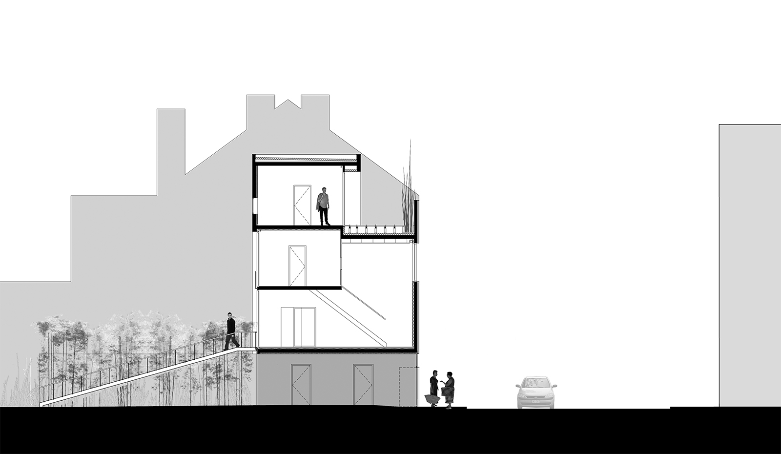 Les dimensions particulières du terrain conduisent à prévoir deux logements combinés. La volumétrie simple de la bâtisse l’intègre naturellement dans la succession des résidences citadines. Le principe des maisons combinées se traduit en plan par une division en trois bandes inégales. La partie centrale revisite le thème du couloir : définie comme unique espace servant, elle absorbe l’ensemble des fonctions de technique et de desserte. Elle est alors une zone tampon entre les deux logements, principal et locatif. Les habitations se répartissent chacune sur trois niveaux ; la maison locative, de 70m², occupant une partie des trois premiers niveaux ; la maison principale, de 250m², occupant la majorité des deux niveaux intermédiaires et la totalité du quatrième qui inclut une vaste terrasse. La maison MD se veut tout à la fois traditionnelle, à travers son incorporation à l’existant, et contemporaine, à travers son langage interne. Si les élévations sur rue et sur jardin ont en commun un dessin rigoureux, elles se distinguent par leur rapport à l’environnement extérieur. La façade jardin est largement vitrée sauf au dernier étage, résolument tourné vers la terrasse sur rue. Sur les trois niveaux inférieurs, les ouvertures ne sont pas hiérarchisées en fonction de l’usage des pièces. Elles dilatent le logement vers le jardin. Dès l’entrée, commune aux deux résidences, l’espace s’ouvre sur un cœur d’îlot richement planté ; le portail constituant une simple transition vers l’espace extérieur privatif. L’accès au logement principal se fait au R+1 par un escalier en pente douce depuis le jardin. Le logement locatif est accessible depuis le carport. Le logement principal bénéficie d’un séjour en double hauteur éclairé sur la rue en partie haute et largement ouvert sur le jardin.
